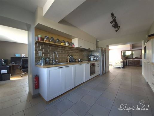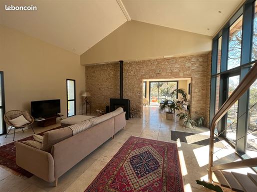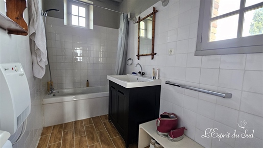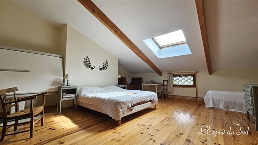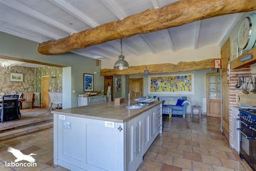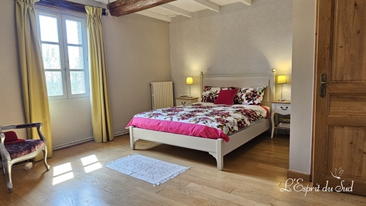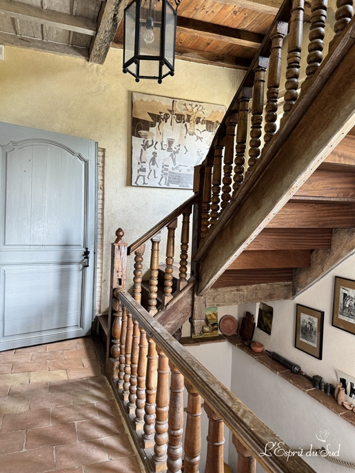 La maison principale développe près de 240 m² habitables sur deux niveaux et se distingue par son élégant pigeonnier en façade, signature architecturale du lieu.