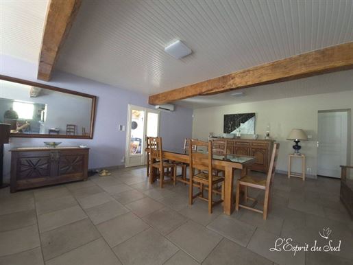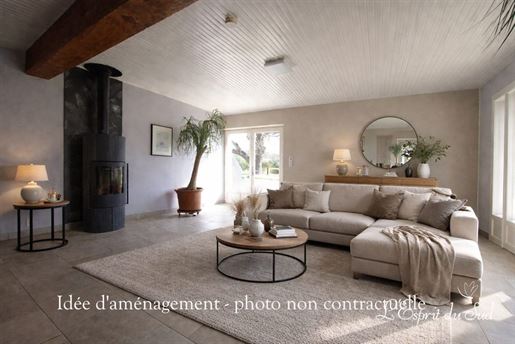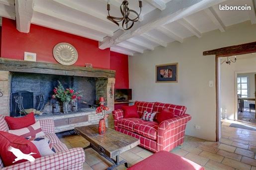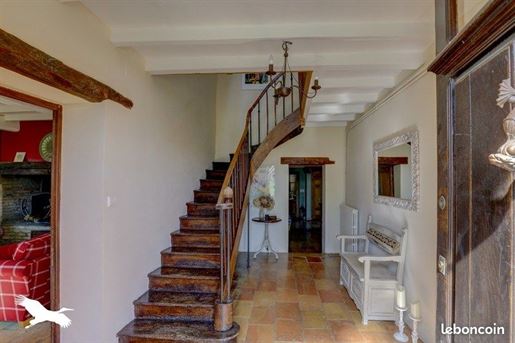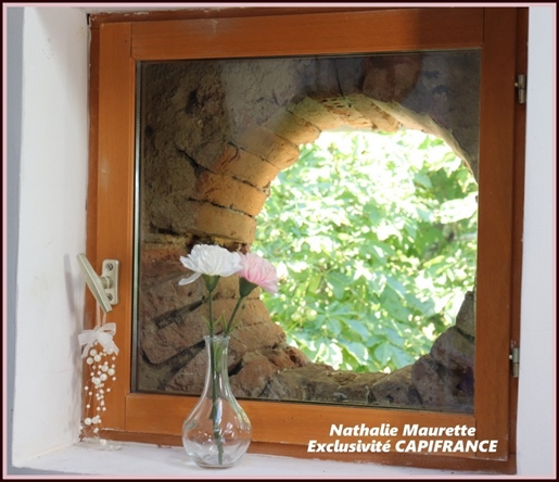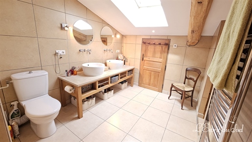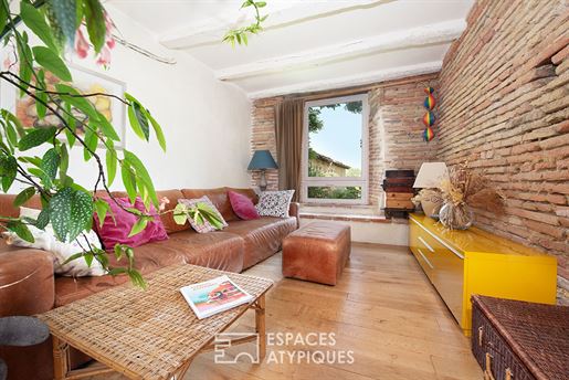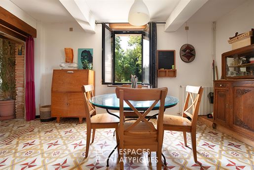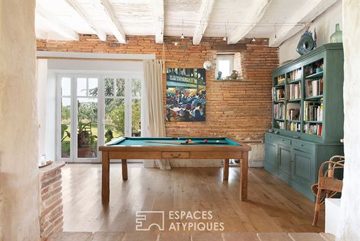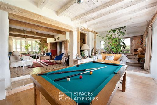 Les intérieurs conservent l'âme des demeures de caractère : murs en brique foraine, poutres apparentes, hauteurs sous plafond et circulation fluide entre les pièces.