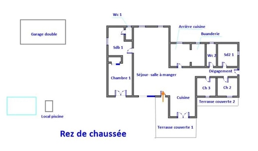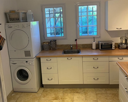 Porch, entrance hall, separate toilet with washbasin, utility room, laundry room, fitted American kitchen opening onto a pergola terrace, living room with fireplace, opening onto a covered terrace, one bedroom with fitted wardrobe, shower room.