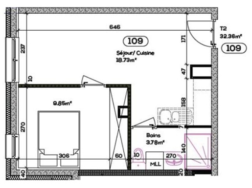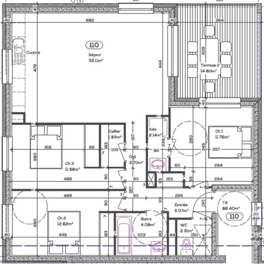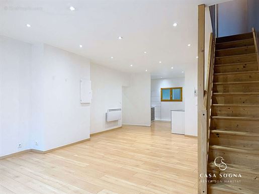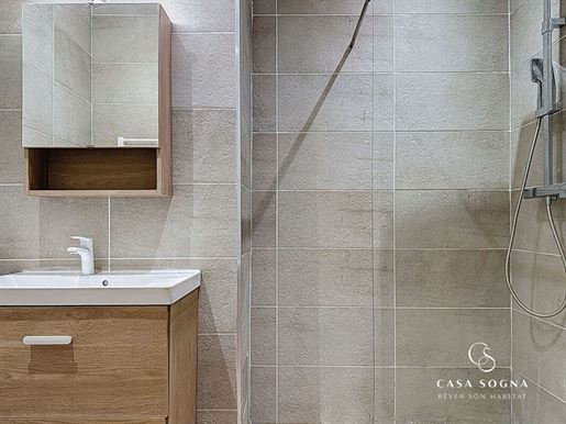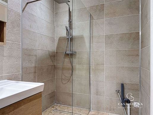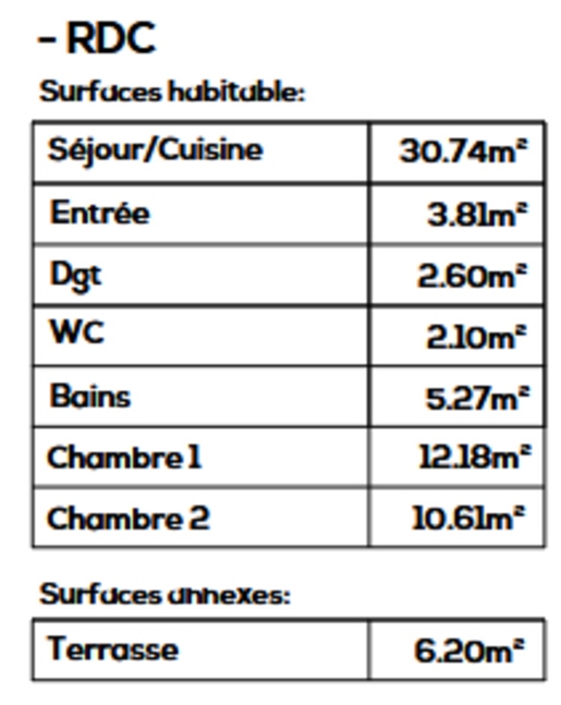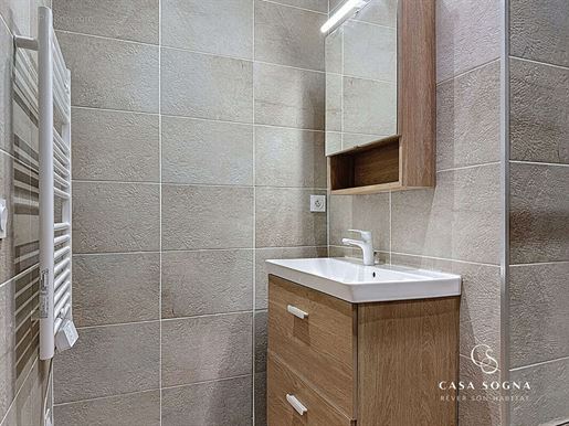 Au rez-de-jardin (au-dessus 3 pièces, 100,39m²), nous avons une cuisine équipée, 2 chambres et une salle de bains avec Wc. Également à cet étage, une belle et grande terrasse de 60m² avec vue sur le Mont des Princes.