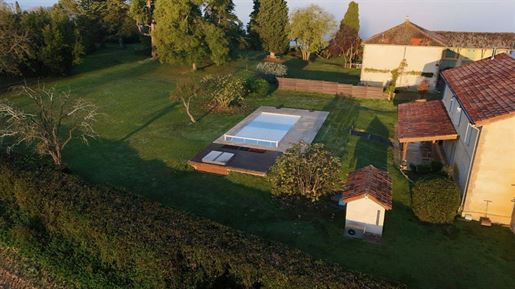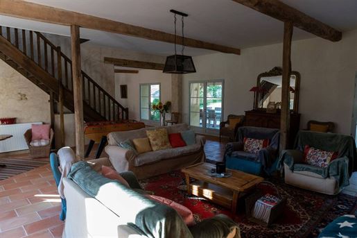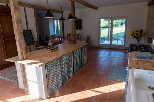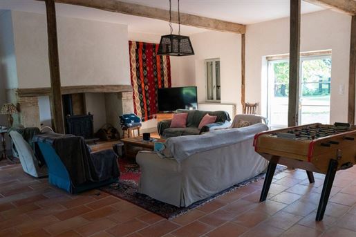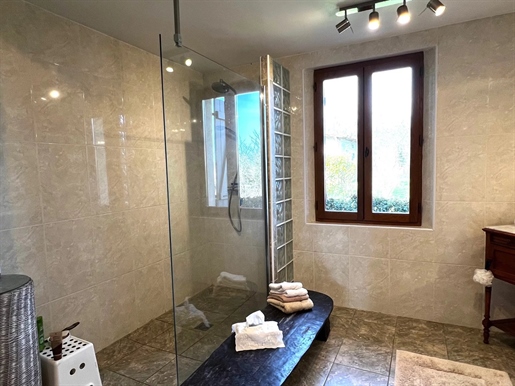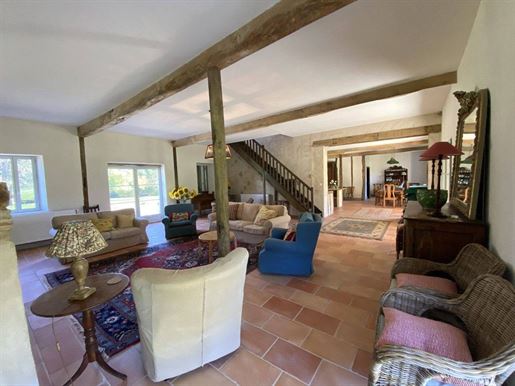 L-shaped barn attached to the manor, 160 m² per level, with corresponding upper floor area.Additional 120 m² room.11 x 5 m saltwater swimming pool, heated, with rolling cover, surrounded by Burgundy stone.7-person jacuzzi (2024).Fully enclosed property.Pool subtly integrated behind the farmhouse with terrace.Beautiful entrance gate opening onto the courtyard.Landscaped park with mature trees.Technical Aspects
