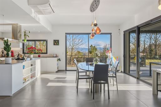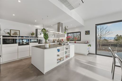 Divonne Sotheby's International Realty vous présent une magnifique maison contemporaine de standing, située dans un environnement résidentiel prisé et recherché. Édifiée en 2022 sur un terrain de près de 800 m², elle bénéficie d’un panorama spectaculaire sur les Alpes, le Mont-Blanc et le Jura.