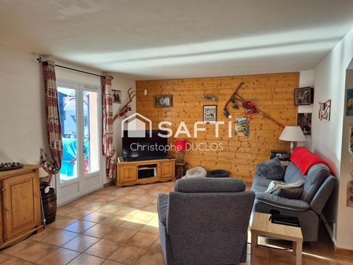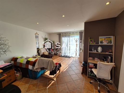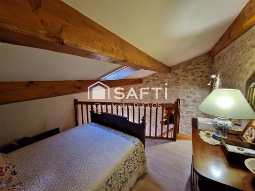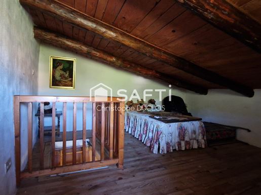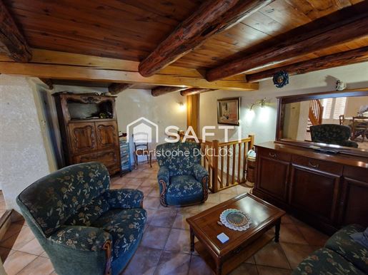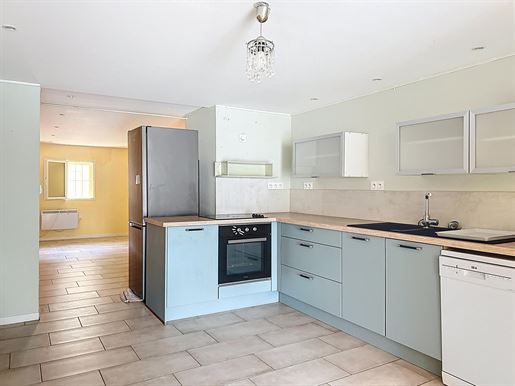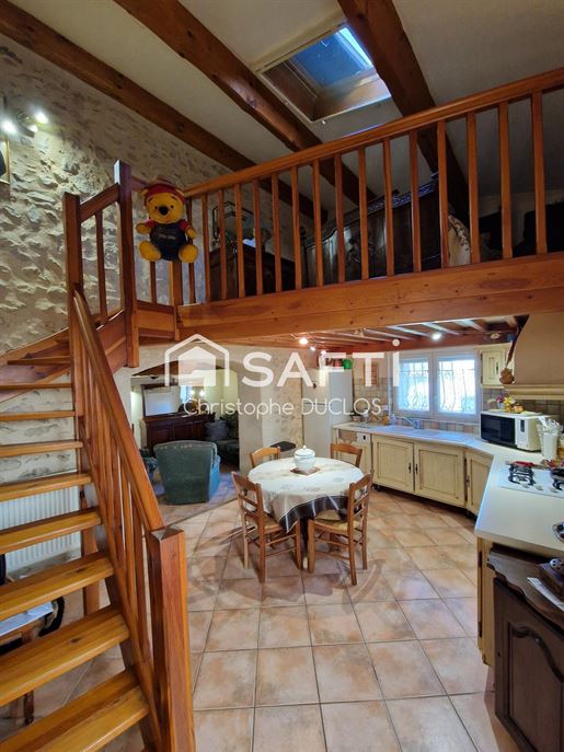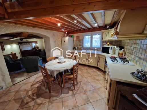 L'entrée cossue avec sa belle hauteur sous plafond s'ouvre sur une cuisine séparée, de très belle facture, puis sur un salon chaleureux d'environ 32 m² où le bois, présent dans les poutres, crée une atmosphère authentique soulignée par la cheminée à foyer fermé.