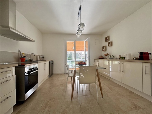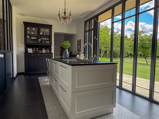 La cuisine moderne, élégante et ultra-fonctionnelle, s'ouvre sur le jardin par de grandes baies vitrées en fer forgé.