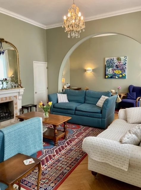 Après cette chambre, une porte vitrée nous mène au spacieux salon, baigné de lumière grâce à ses fenêtres sur deux côtés. Le parquet ancien souligne l'harmonie entre style classique et touches contemporaines que l'on retrouve dans toute la maison.