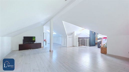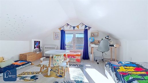 Cette villa s'organise sur trois niveaux et propose un intérieur spacieux et lumineux. Une entrée pratique dessert le séjour-cuisine et l'espace nuit du rez-de-chaussée. Le vaste séjour-cuisine de 45 m², équipé d'une cuisine Schmidt, s'ouvre sur une terrasse prête à être aménagée. Trois chambres sont présentes à ce niveau, ainsi qu'une salle d'eau moderne avec douche, double vasque et Wc, complétée par un Wc indépendant avec lave-mains.À l'étage, les combles ont été aménagés en un espace chaleureux idéal pour les enfants. On y trouve une mezzanine, parfaite pour une salle de jeux, deux chambres mansardées ainsi qu'une salle de bains avec Wc sanibroyeur.Le sous-sol entièrement ouvert réunit garage, atelier, buanderie et chaufferie sur plus de 87 m². Une cave fermée de 20 m² vient compléter cet espace, idéale pour le stockage ou la conservation de vins.
