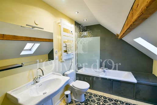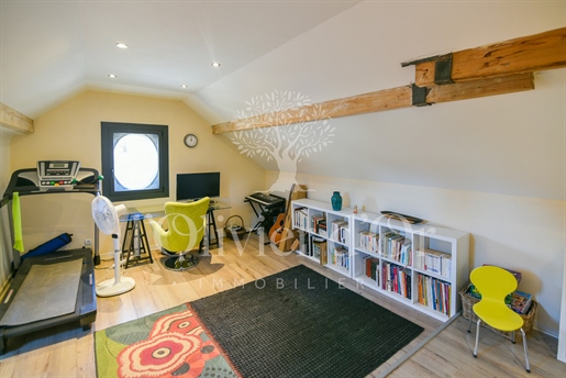 Le rez-de-jardin s'ouvre sur une entrée double menant à un vaste séjour baigné de lumière, agrémenté d'une cheminée suspendue, et prolongé par un espace repas convivial et une cuisine équipée au charme authentique. Une chambre confortable complète ce niveau.