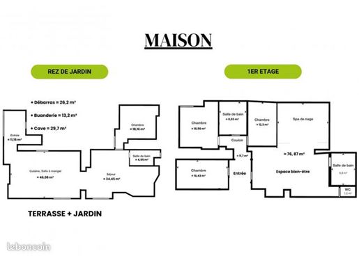 74130 - Vougy - Exclusivité - Maison 7 Pièces (298,08 m²) Avec Espace Bien-Être +Jardin (300 m2) + Appartement T3 (84,2 m²) + Combles Aménageables (276,3 m²) – Prestations Haut De Gamme - Double Garage + Cave + 3 Annexes – Idéal Gîte, Airbnb Ou Projet Familial Efficity, l'agence qui estime votre bien en ligne et Cédric Brun vous proposent : //////// Visite Virtuelle Sous Mot De Passe, Disponible Sur Demande ///////// Au cœur de la commune de Vougy, dans un endroit calme et proche du centre, cette magnifique propriété vous séduira par la qualité de ses prestations, son jardin arboré et ses multiples possibilités d'usage. Elle s'adresse aussi bien aux familles nombreuses, aux investisseurs, qu'aux porteurs de projets de location touristique ou de gîte. ? Côté Intérieur : Bien de 773 m² sur 3 niveaux – 2 logements indépendants avec accès séparés 0. Sous-Sol Cave + Chaufferie : 38,74 m² 1. Maison (298,08 m²) : ➖ Rez De Jardin ➖ • Entrée/dégagement : 11,15 m² • Cuisine / Salle à manger : 46,08 m² • Séjour : 34,45 m² • Bureau ou chambre : 18,16 m² • Wc séparé : 4,95 m² ☀️ Une grande terrasse exposée sud-ouest ≃ 30 m², ouverte sur un jardin arboré de 300 m², offre un espace idéal pour les repas en extérieur, les instants de détente ou les soirées d'été entre amis. ➖ 1Er Étage ➖ • Chambre n°1 : 18,56 m² • Chambre n°2 : 16,43 m² • Chambre n°3 : 12,3 m² • Salle de bain + Wc : 8,03 m² • Dégagement/couloir : 11,7 m² Un véritable espace bien-être de 76 m² a été aménagé à ce niveau, comprenant un spa de nage avec fonction contre-courant et tapis de marche intégré, idéal pour allier détente et activité physique. Cet espace est complété par une salle d'eau et des Wc séparés, offrant un confort optimal. 2. Appartement Avec Entrée Indépendante (84,2 m²) ➖ 1Er Étage ➖ • Entrée : 1,92 m² • Séjour/Cuisine : 35,25 m² ouverte sur un balcon avec vue dégagée • Chambre n° 1 : 14,6 m² • Chambre n°2 : 13,78 m² • Salle de bain : 4,37 m² • Wc séparé : 1,98 m² • Espace rangement : 2,13 m² • Couloir : 10,17 m² 3. Combles Aménageables (276,3 m²) ➖ 2E Étage ➖ Parfaitement exploitables pour créer un appartement supplémentaire, des chambres, un espace jeux, ou tout autre projet selon vos envies. ? Côté Extérieur, Le Bien Offre : • Un jardin arboré de 300 m², parfait pour profiter de la nature • Une terrasse en rez-de-jardin d'environ 30 m², exposé sud-ouest, idéale pour les repas et la détente • Un balcon au 1er étage, offrant une vue dégagée • Un carnotzet chaleureux de 8,5 m² Possibilité d'acquérir (en sus) un terrain attenant (autre parcelle) d'une surface de 854 m2, constructible. ? Côté Technique • Rénovation complète effectuée en 2021 • Terrain constructible de 854 m² offrant de belles perspectives d'agrandissement ou de projets annexes • Plusieurs possibilités d'aménagement intérieur selon vos projets • Assainissement collectif conforme • Chauffage au sol hydraulique par géothermie (avec forage) marque Atlantis. Consommation énergétique faible • Adoucisseur d'eau de la marque Culligan • Deux cuisines haut de gamme : de la marque Mobalpa et Aviva • Prestations de qualité dans tout le bien • Spa de nage avec contre-courant et tapis de marche immergé intégré (plus de 50 000 €) ? Côté Pratique • Supermarché à moins de 5 minutes en voiture • Écoles maternelle et primaire accessibles en 3 minutes • Collège à moins de 10 minutes • Hôpital de Bonneville situé à environ 15 minutes • Accès autoroute A40 à moins de 10 minutes • Transports en commun à proximité avec arrêt de bus à quelques minutes à pied • Genève accessible en 37 minutes en voiture N'hésitez pas à me pour plus d'informations ou pour organiser une visite de ce bien d'exception au [Coordonnées masquées] ou par mail à [Coordonnées masquées] Les informations sur les risques auxquels ce bien est exposé sont disponibles sur le site Georisque : georisques. Gouv. Fr Cedric Brun - Ei - est Agent Commercial mandataire en immobilier, immatriculé au Registre Spécial des Agents Commerciaux du Tribunal de Commerce de Annecy sous le n°. Siège social du mandant : effiCity, 48 avenue de Villiers - 75017 Paris - Société par Actions Simplifiée, société au capital de 132 373,05 euros, immatriculée au Rcs Paris 497 617 746 et titulaire de la Carte professionnelle Cpi 002 025 - Cci Paris Idf - Caisse de Garantie : Galian Assurances 89 rue de la Boétie 75008 Paris Référence annonce : 192454 Date de réalisation du diagnostic : Les honoraires sont à la charge du vendeur Montant estimé des dépenses annuelles d'énergie pour un usage standard : entre 4 240 € et 5 790 € sur les années 2021, 2022 et 2023 (abonnements compris).Demander plus d'informations
