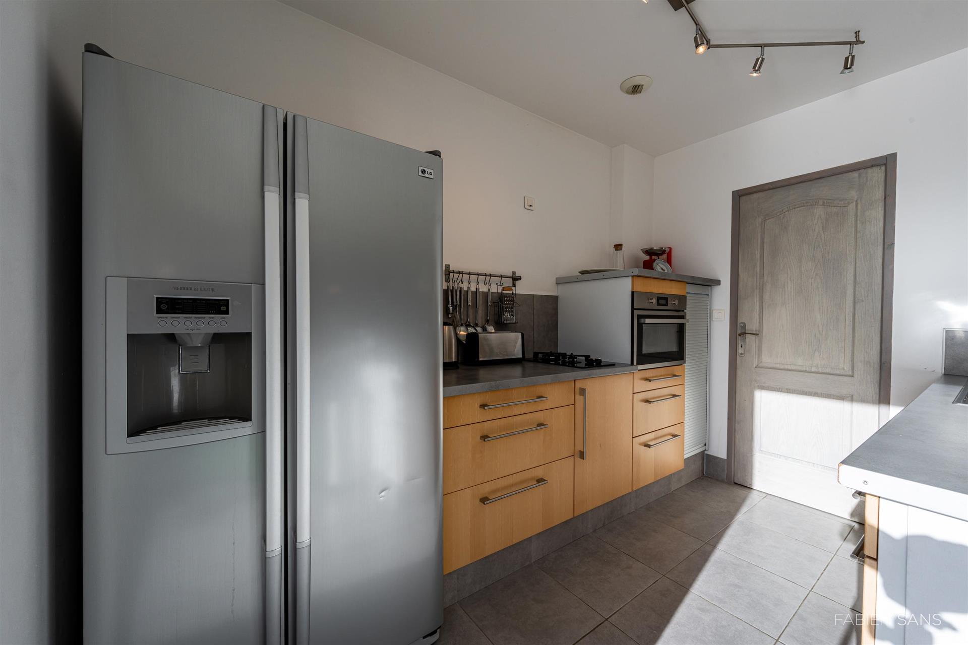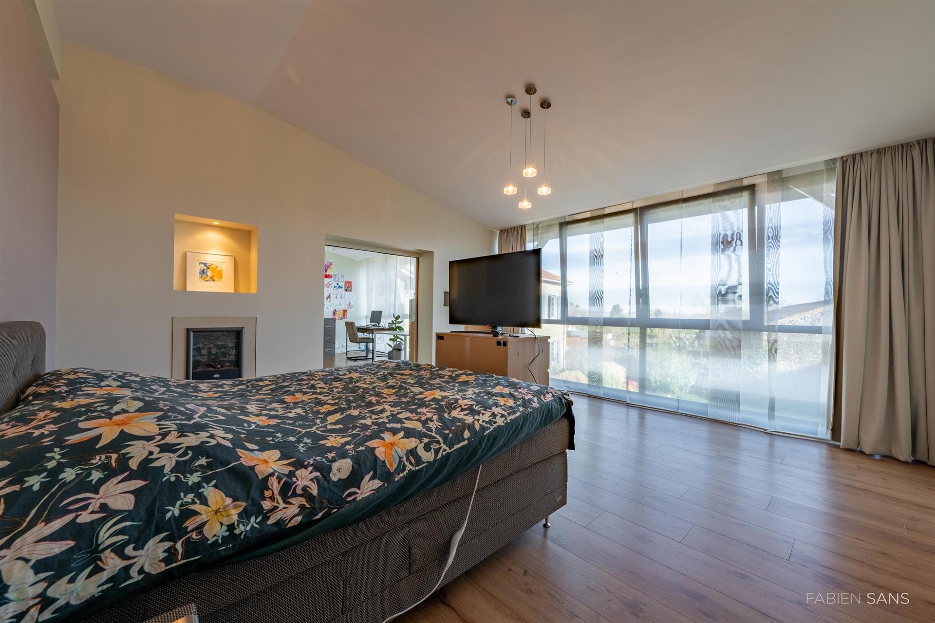 On this floor are the living room, kitchen, stairwell, toilet and a bedroom. The large kitchen is equipped with a cooking island, built-in appliances and a double sink. You can enjoy the cozy fireplace in both the living room and the kitchen. You can also enter the garden through the living room and kitchen. The bedroom is wheelchair friendly and has its own entrance with living room and a bathroom.