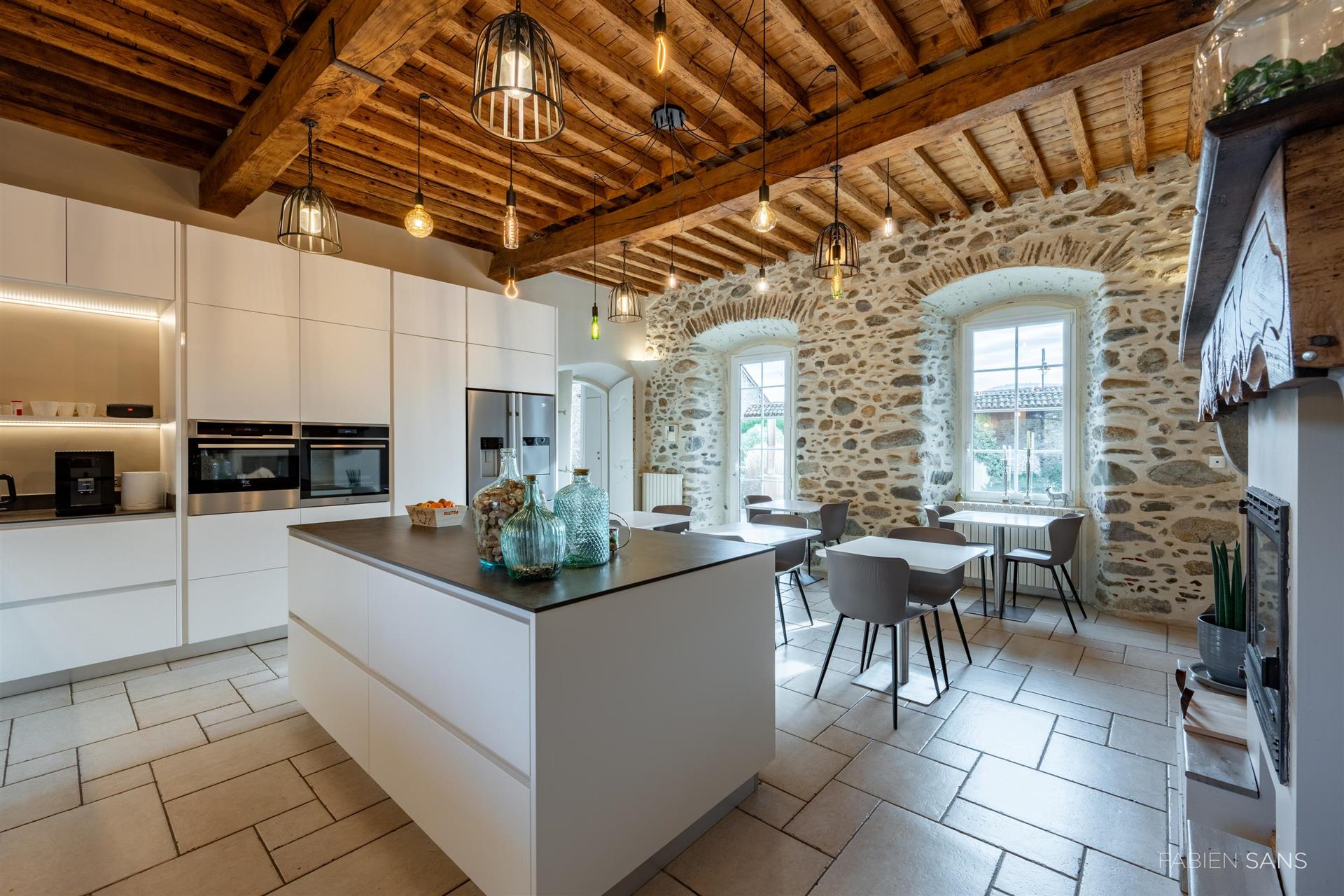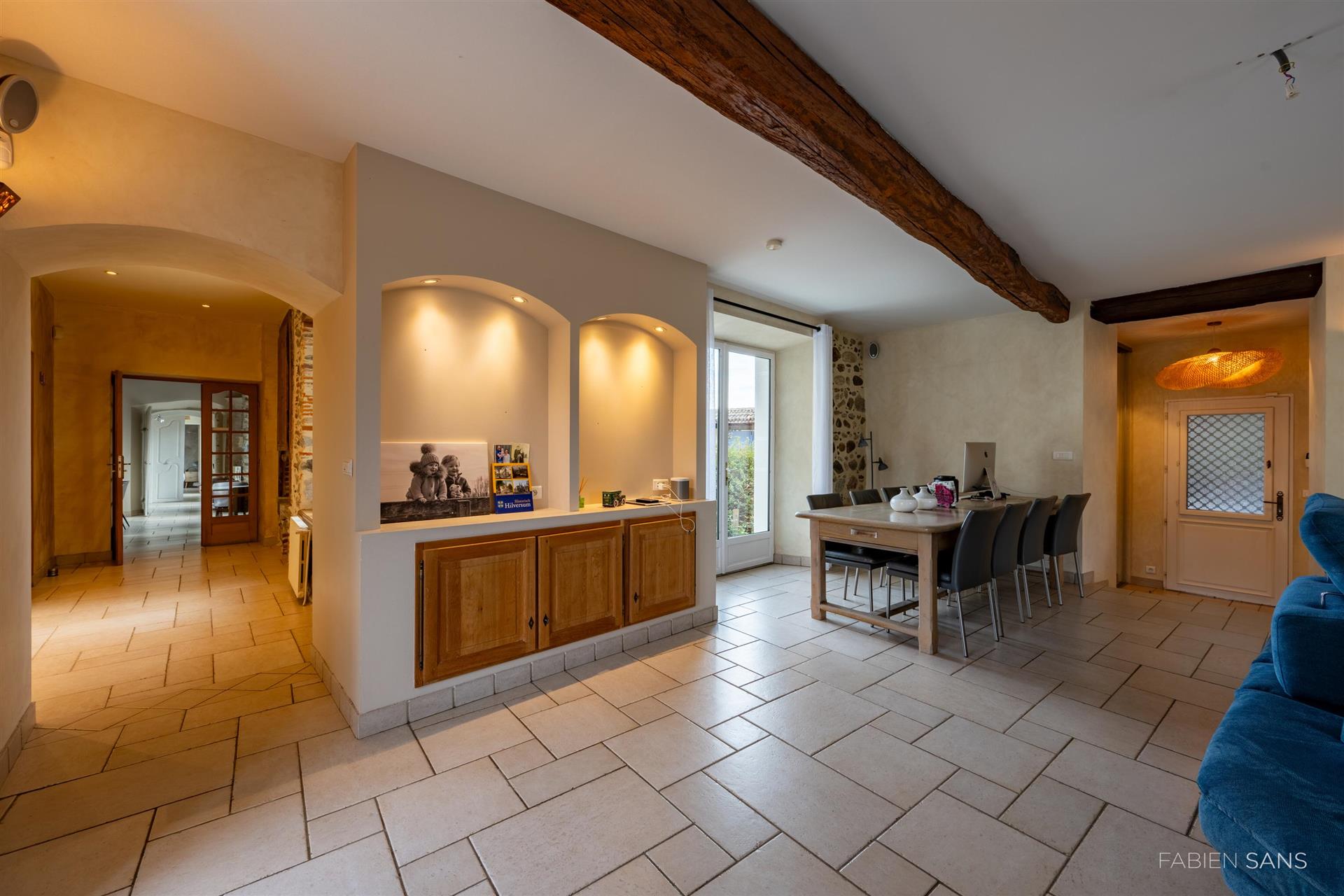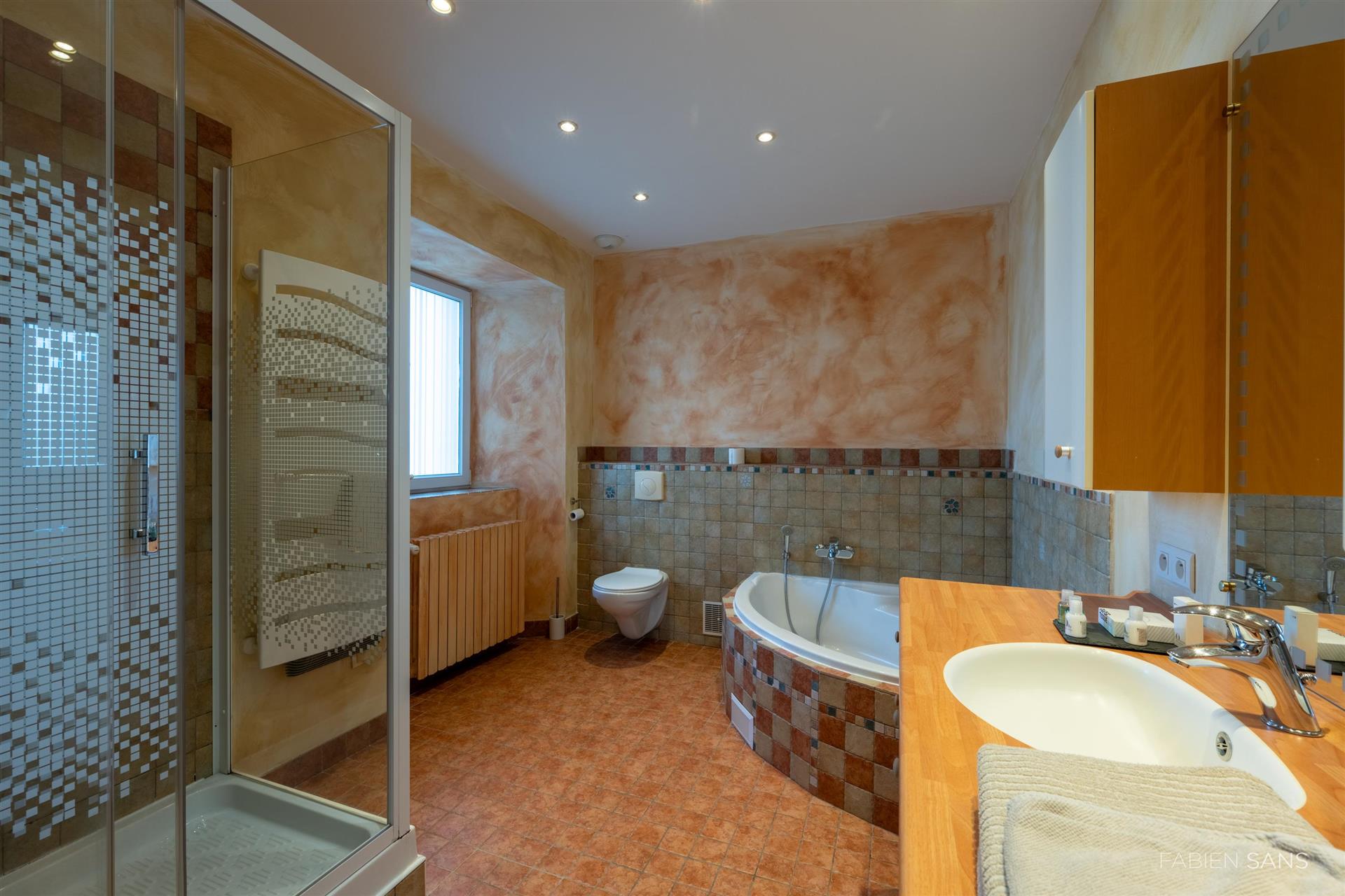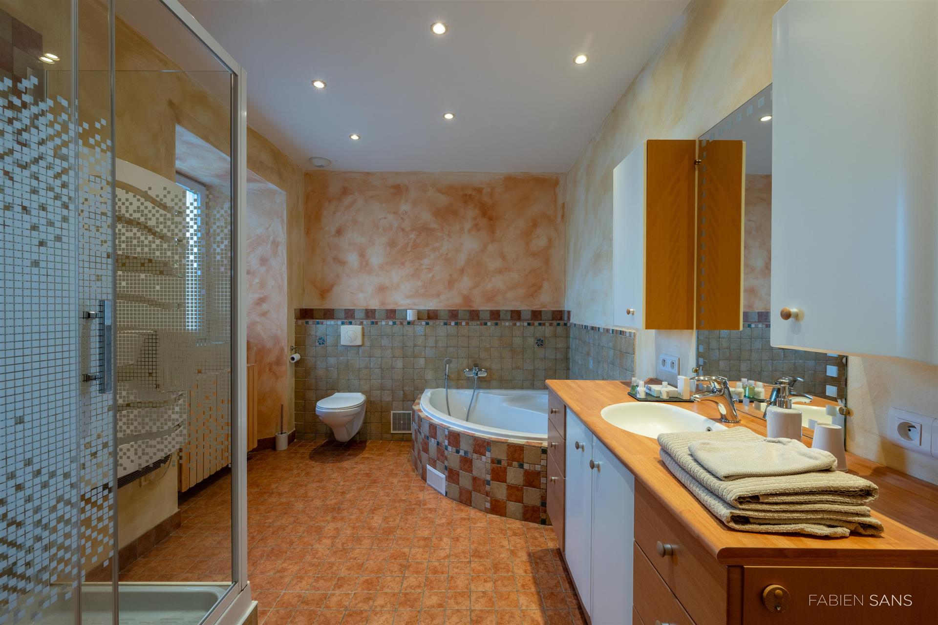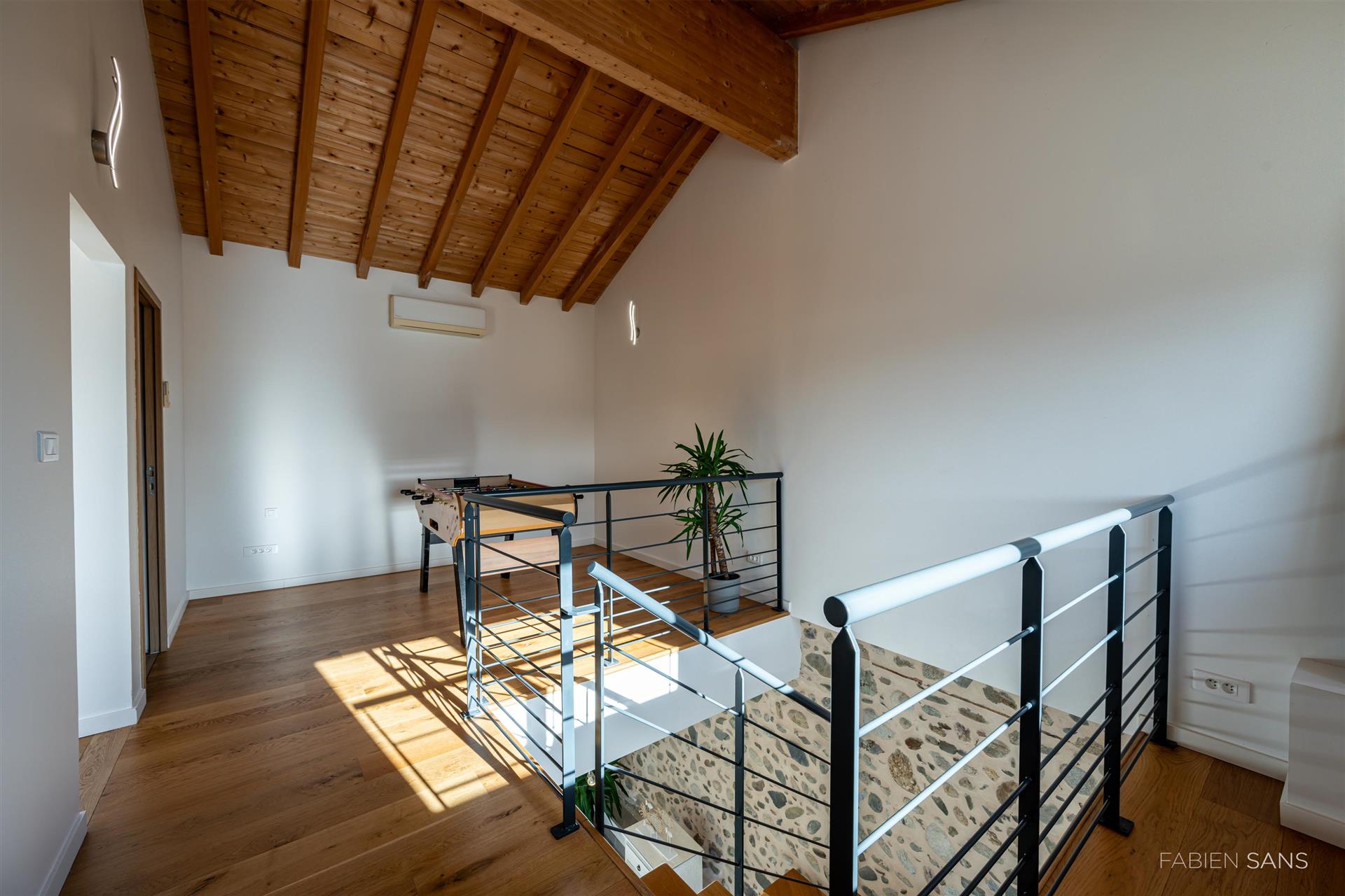 On the first floor there are three B&B bedrooms. Two rooms have a toilet, bathroom and double beds. The four-person room has two bedrooms, a private toilet and bathroom with jacuzzi! The rooms feature large windows that overlook the beautiful Ausson countryside. In the barn conversion you will find two more bedrooms with a gym/office, large bathroom with double bath, double shower and dressing room. These spaces are now in private use but can also be converted into luxury B&B rooms or Gîtes.