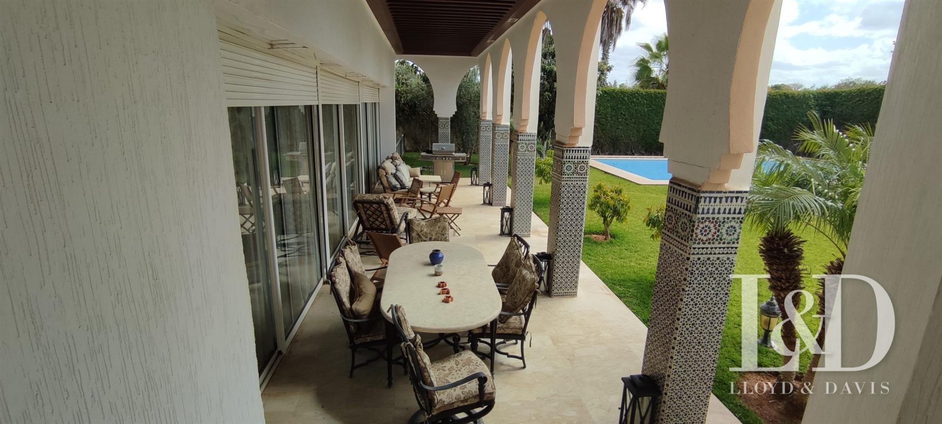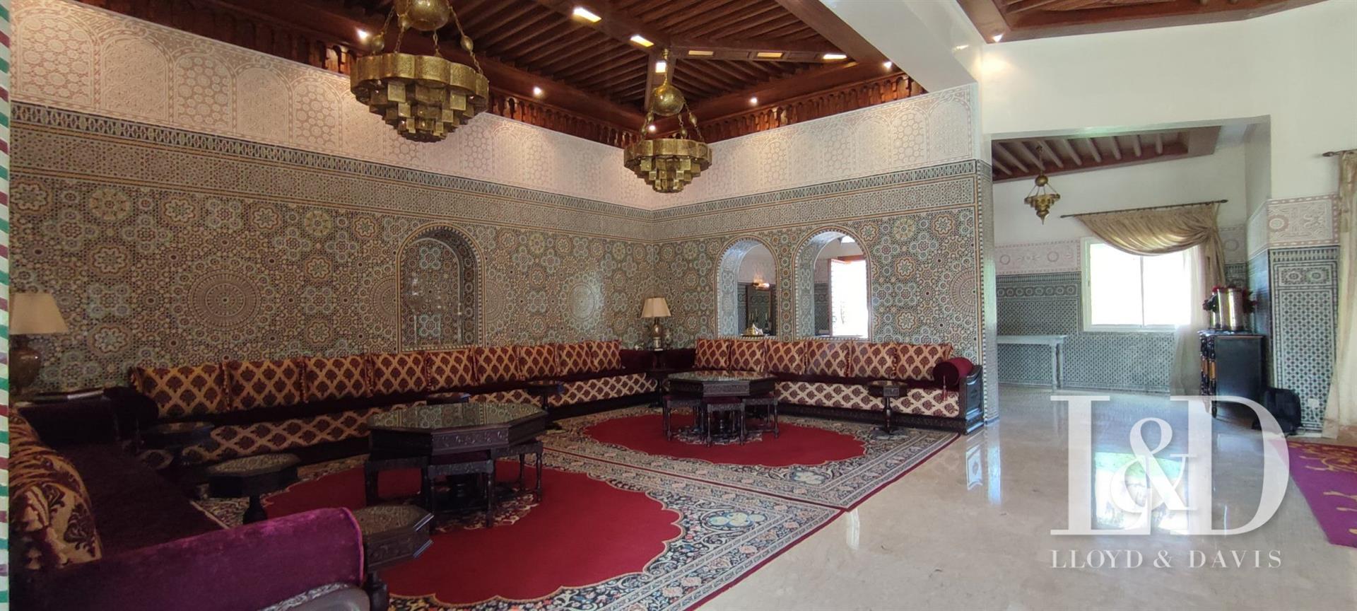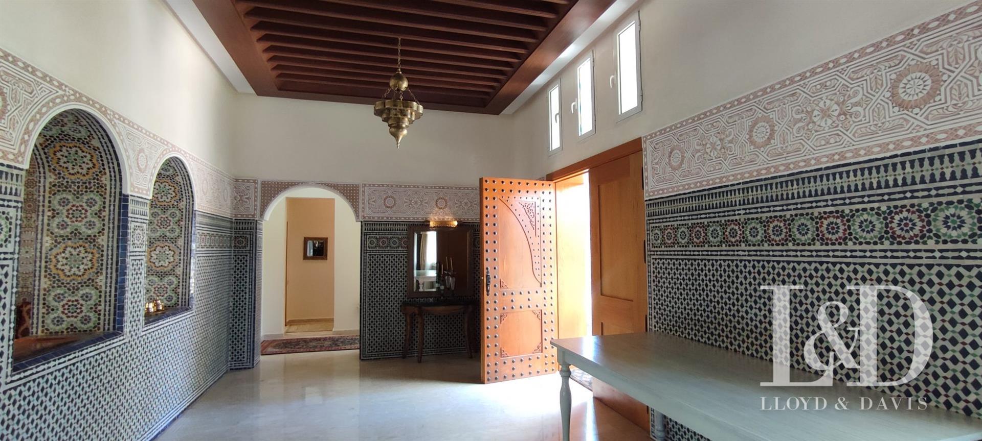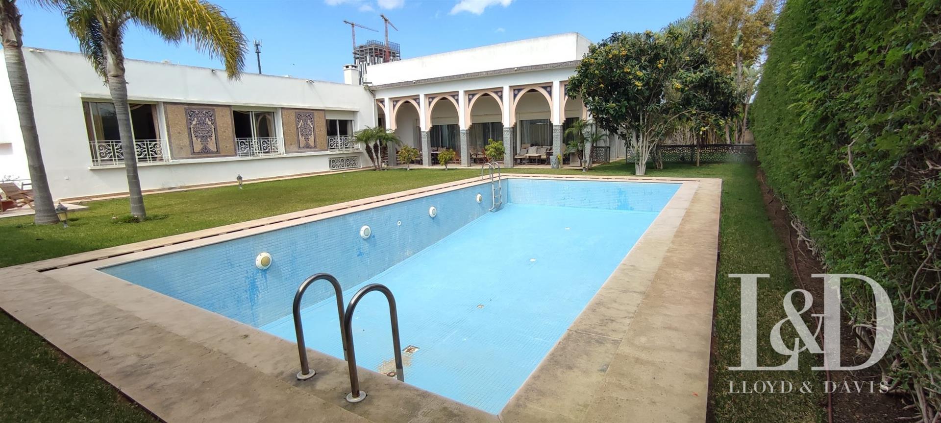 Offrez-Vous un bijou architectural au cœur de Souissi, à proximité du champ de courses. Cette magnifique villa de style oriental, de plain-pied, se distingue par ses volumes généreux, ses finitions raffinées et son ambiance élégante.Caractéristiques principales :Surface terrain : 1 720 m²Surface bâtie : 800 m²Orientation : Plein sudArchitecture : Plafonds sculptés, zellige, marbre, et éléments traditionnels d’exceptionDisposition :Rez-de-chaussée :Vaste réception avec cheminée et hauteur sous plafond de 4,50 mSalon marocain authentiqueSalle d’eau invitésEntresol :Grande cuisine équipéeSalle à manger convivialeBureau indépendantMaster Suite avec dressing spacieux et salle de bain privativeSalle d’eau invitésRez-de-jardin :3 Suites juniors avec dressing et salle de bainSalon Tv ou détenteSalle de jeuxSpa privé avec hammam et jacuzziBuanderie, chambre de service avec salle de bainCour anglaise apportant lumière et fraîcheurExtérieur :Piscine privéeGarage fermé pour 3 voituresLoge gardienJardin avec arrosage automatiquePanneaux solaires et climatisation Split